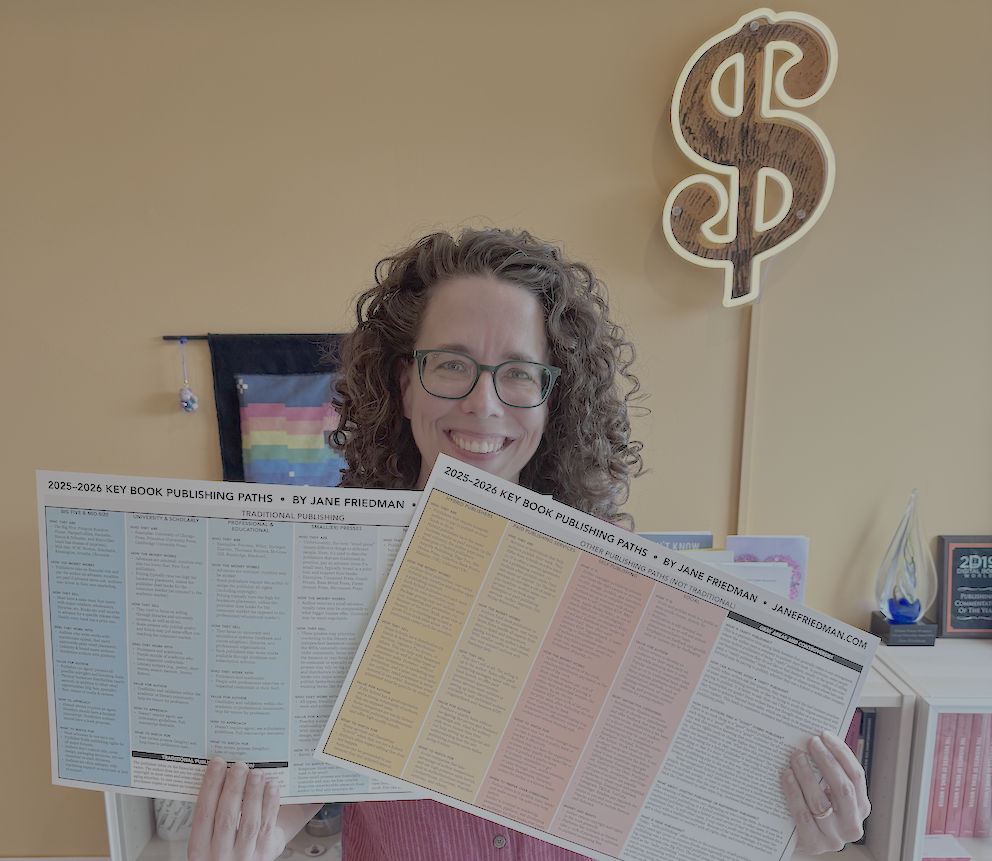 - The Key Book Publishing Paths Chart: This is my signature comprehensive guide that breaks down the pros, cons, and financial realities of traditional publishing, self-publishing, hybrid models, and everything in between. I’ve professionally printed it on a two-sided laminated sheet (full color). Anyone purchasing a copy of The Business of Being a Writer, Second Edition will receive this chart for free.